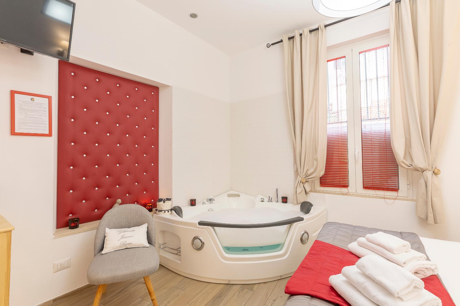 La camera Glamour Jacuzzi è una lussuosa camera di 15 metri quadri per intenditori con vasca idromassaggio angolare doppia proprio accanto al vostro grandissimo letto (cm. 190 x 200) a forma di corpo di donna con comodissimo materasso in memory. Casse Bluetooth per ascoltare la vostra musica preferita. La camera dispone di un bagno interno con doccia. Il prezzo delle camere comprende pulizie con cambio biancheria ogni 4 giorni, una lussuosa linea di cortesia (shampoo, saponi, salviette, ecc), connessione WiFi gratuita e superveloce, aria condizionata e Smart TV con canali Netflix, distributore di bevande calde disponibile 24 ore su 24.