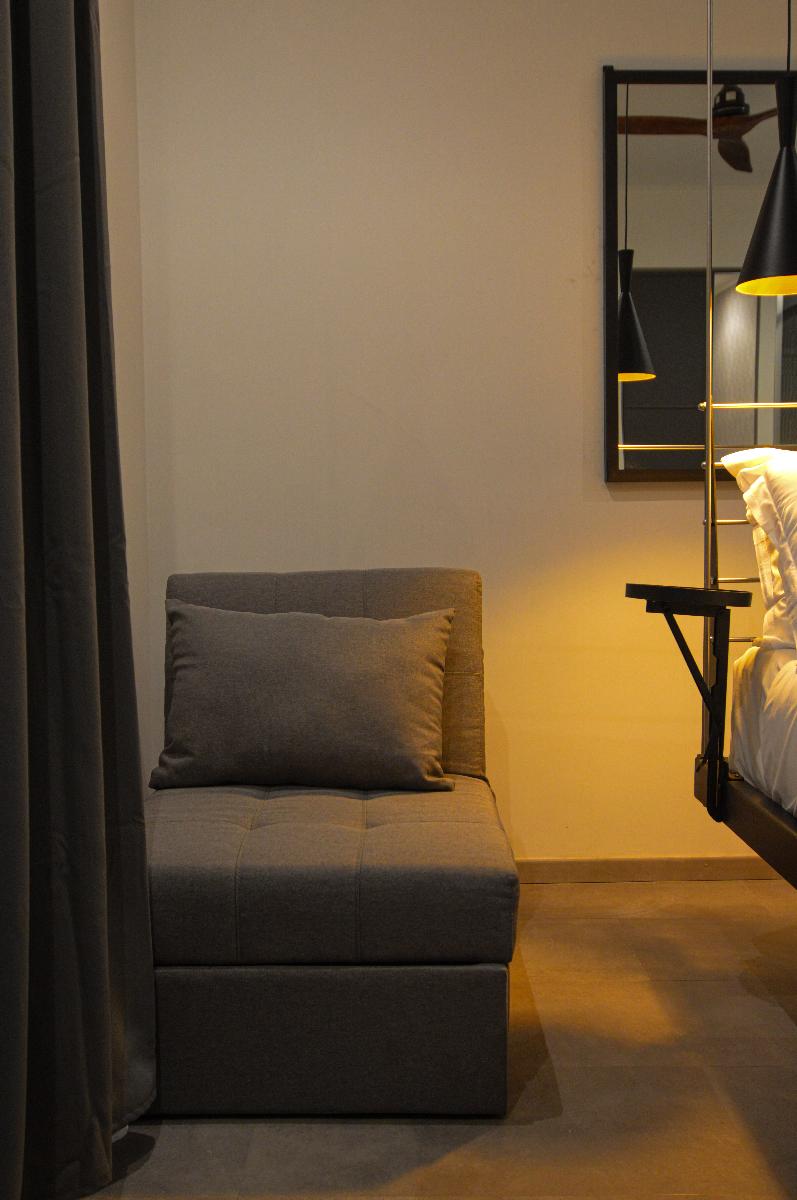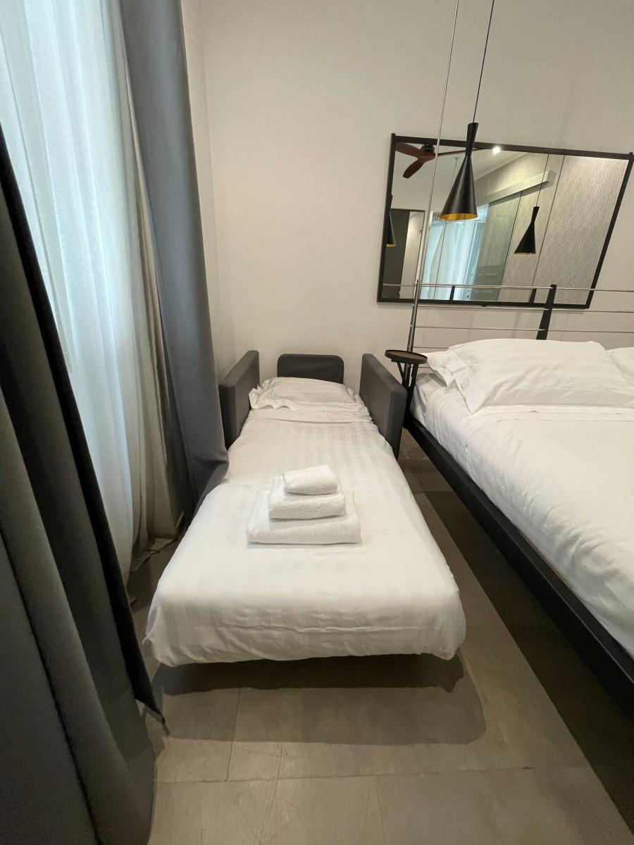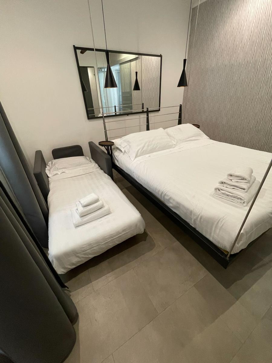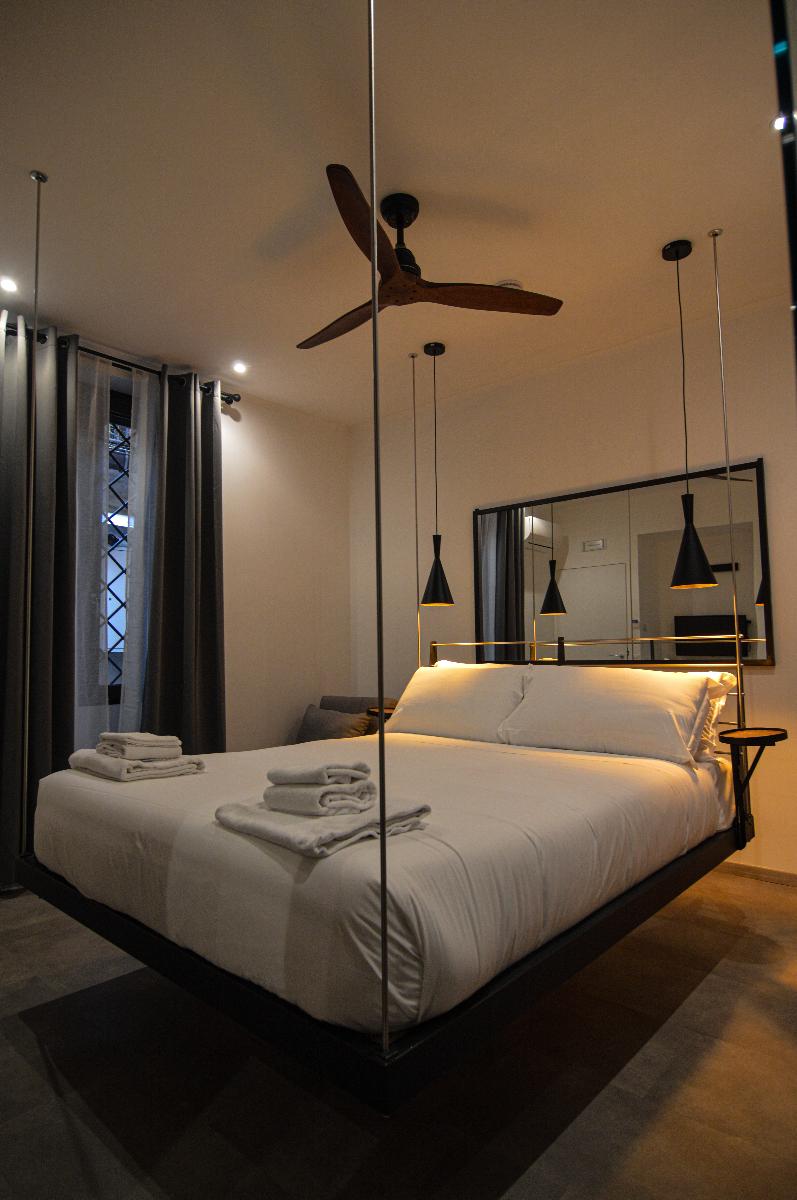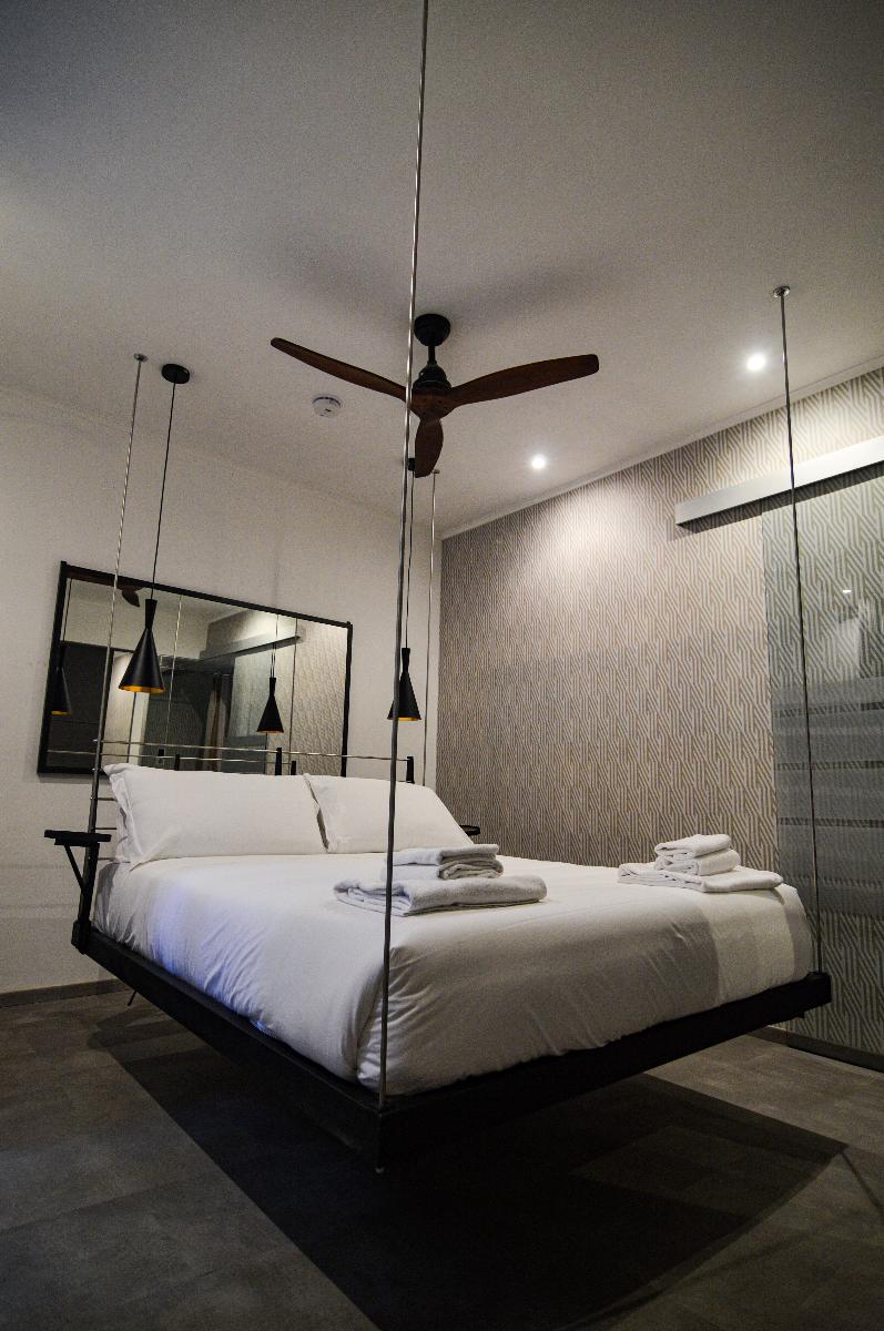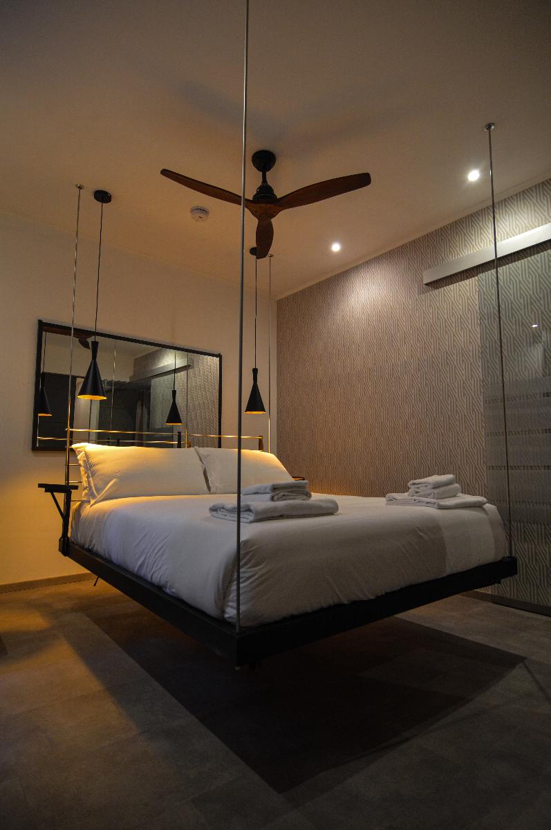 La camera Aria è una lussuosa camera tripla con letto sospeso (cm. 160 x 200) con tiranti in acciaio, comodissimo materasso e topper in memory e divano letto singolo. La camera dispone di un bagno interno e doccia emozionale con vetrata che dà sulla camera e di un frigobar.