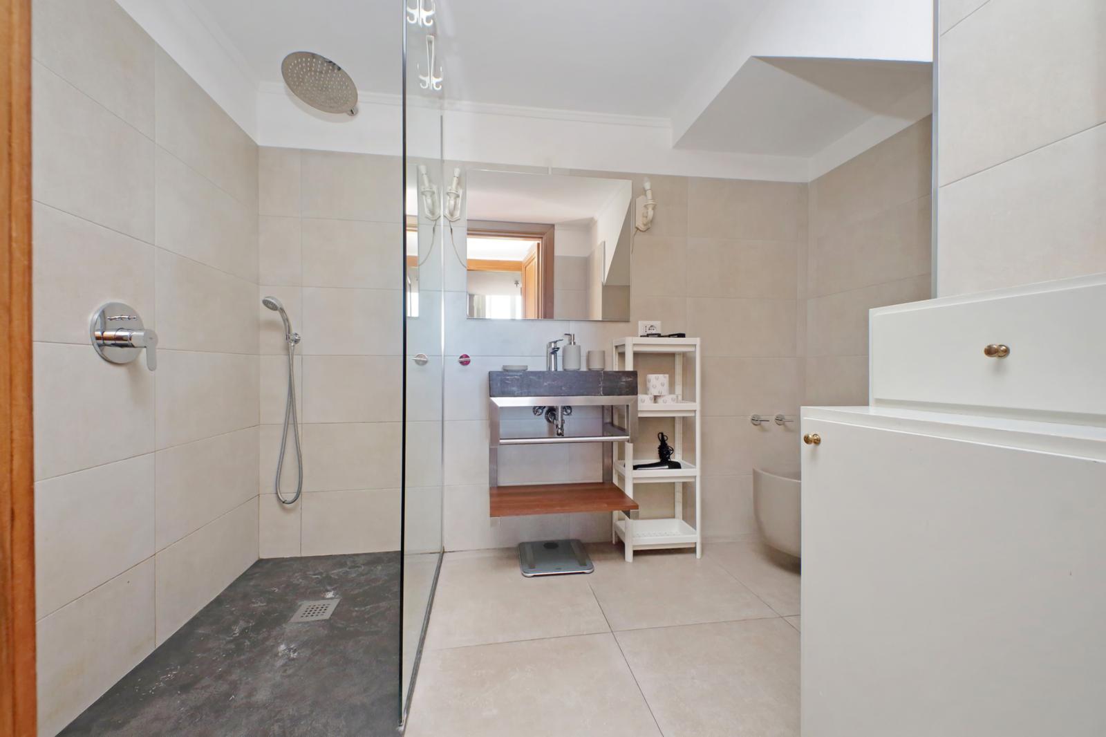 Bagno moderno con ampia doccia in pietra e vetro, wc, bidet e lavabo.
